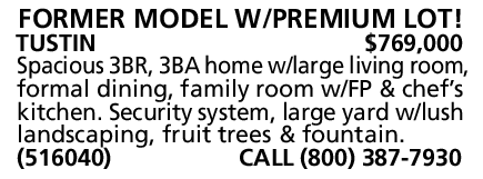 TUSTIN $769,000 Spacious 3BR, 3BA home w/large living room, formal dining, family room w/FP & chef’s kitchen. Security system, large yard w/lush landscaping, fruit trees & fountain. (516040) CALL (800) 387-7930