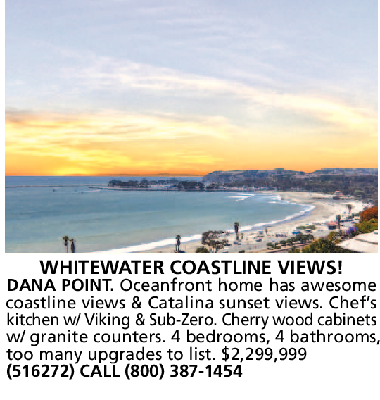 DANA POINT. Oceanfront home has awesome coastline views & Catalina sunset views. Chef’s kitchen w/ Viking & Sub-Zero. Cherry wood cabinets w/ granite counters. 4 bedrooms, 4 bathrooms, too many upgrades to list. $2,299,999 (516272) CALL (800) 387-1454