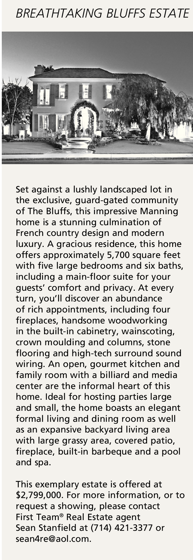 Set against a lushly landscaped lot in the exclusive, guard-gated community of The Bluffs, this impressive Manning home is a stunning culmination of French country design and modern luxury. A gracious residence, this home offers approximately 5,700 square feet with five large bedrooms and six baths, including a main-floor suite for your guests’ comfort and privacy. At every turn, you’ll discover an abundance of rich appointments, including four fireplaces, handsome woodworking in the built-in cabinetry, wainscoting, crown moulding and columns, stone flooring and high-tech surround sound wiring. An open, gourmet kitchen and family room with a billiard and media center are the informal heart of this home. Ideal for hosting parties large and small, the home boasts an elegant formal living and dining room as well as an expansive backyard living area with large grassy area, covered patio, fireplace, built-in barbeque and a pool and spa.