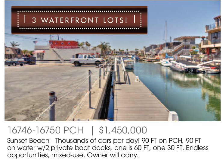 Sunset Beach - Thousands of cars per day! 90 FT on PCH, 90 FT on water w/2 private boat docks, one is 60 FT, one 30 FT. Endless opportunities, mixed-use. Owner will carry.