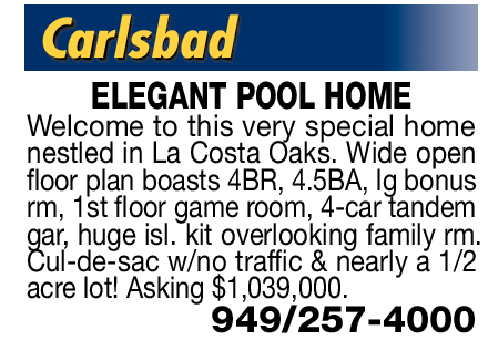 ELEGANT POOL HOME Welcome to this very special home nestled in La Costa Oaks. Wide open loor plan boasts 4BR, 4.5BA, lg bonus rm, 1st loor game room, 4-car tandem gar, huge isl. kit overlooking family rm. Cul-de-sac w/no trafic & nearly a 1/2 acre lot! Asking $1,039,000.