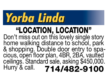 Yorba Linda “LOCATION, LOCATION” Don’t miss out on this lovely single story home walking distance to school, park & shopping. Double door entry to spacious, open loor plan, 4BR, 2BA, vaulted ceilings. Standard sale, asking $450,000. Hurry & call. 714/482-9100