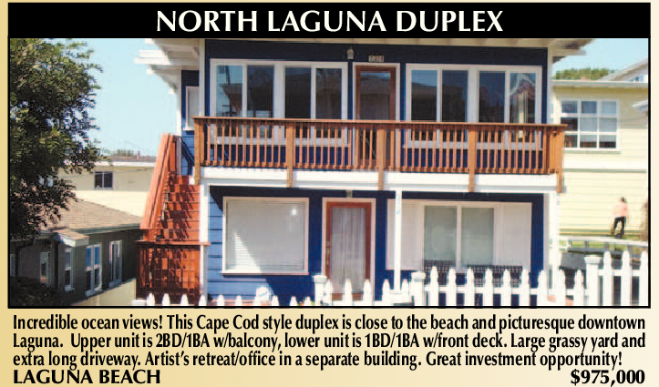NORTH LAGUNA DUPLEX Incredible ocean views! This Cape Cod style duplex is close to the beach and picturesque downtown Laguna. Upper unit is 2BD/1BA w/balcony, lower unit is 1BD/1BA w/front deck. Large grassy yard and extra long driveway. Artist’s retreat/office in a separate building. Great investment opportunity! LAGUNA BEACH $975,000