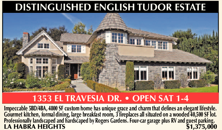 Impeccable 5BD/4BA, 4800 SF custom home has unique grace and charm that defines an elegant lifestyle. Gourmet kitchen, formal dining, large breakfast room, 3 fireplaces all situated on a wooded 40,500 SF lot. Professionally landscaped and hardscaped by Rogers Gardens. Four-car garage plus RV and guest parking. LA HABRA HEIGHTS $1,375,000
