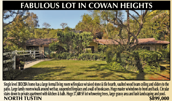 Single level 3BD/2BA home has a large formal living room w/fireplace w/raised stone & tile hearth, vaulted wood beam ceiling and sliders to the patio. Large family room w/walk around wet bar, suspended fireplace and a wall of bookcases. Huge master w/windows to front and back. Circular stairs down to private apartment with kitchen & bath. Huge 37,680 SF lot w/towering trees, large grassy area and lush landscaping and pool. NORTH TUSTIN $899,000