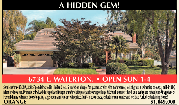 A HIDDEN GEM! 6734 E. WATERTON. • OPEN SUN 1-4 Semi-custom 4BD/3BA, 3241 SF gem is located in Hidden Crest. Situated on a huge, flat quarter acre lot with mature trees, lots of grass, a swimming pool/spa, built-in BBQ island and dog run. Dramatic entry leads to step-down living room w/brick fireplace and soaring ceilings. Kitchen has center island, dual pantry and newer Jenn-Air appliances. Formal dining w/French doors to patio, large open family room w/fireplace, built-in book cases, entertainment center and wet bar. Perfect entertaining home! ORANGE $1,049,000