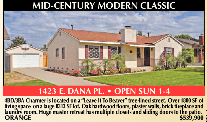 MID-CENTURY MODERN CLASSIC 1423 E. DANA PL. • OPEN SUN 1-4 4BD/3BA Charmer is located on a “Leave It To Beaver” tree-lined street. Over 1800 SF of living space on a large 8313 SF lot. Oak hardwood floors, plaster walls, brick fireplace and laundry room. Huge master retreat has multiple closets and sliding doors to the patio. ORANGE $539,900