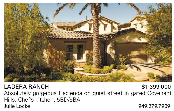 LADERA RANCH $1,399,000 Absolutely gorgeous Hacienda on quiet street in gated Covenant Hills. Chef’s kitchen, 5BD/6BA. Julie Locke 949.279.7909