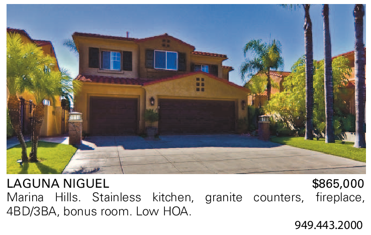 LAGUNA NIGUEL $865,000 Marina Hills. Stainless kitchen, granite counters, fireplace, 4BD/3BA, bonus room. Low HOA.