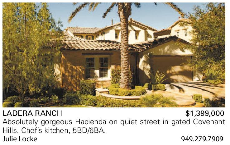 LADERA RANCH $1,399,000 Absolutely gorgeous Hacienda on quiet street in gated Covenant Hills. Chef’s kitchen, 5BD/6BA. Julie Locke 949.279.7909