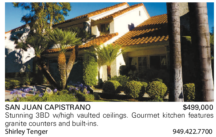 SAN JUAN CAPISTRANO $499,000 Stunning 3BD w/high vaulted ceilings. Gourmet kitchen features granite counters and built-ins. Shirley Tenger 949.422.7700