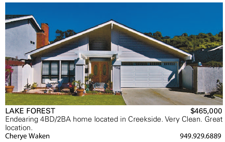 LAKE FOREST $465,000 Endearing 4BD/2BA home located in Creekside. Very Clean. Great location. Cherye Waken 949.929.6889