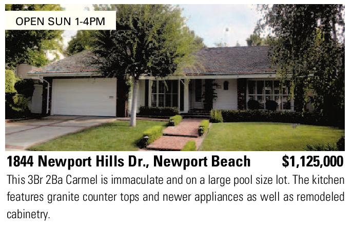 1844 Newport Hills Dr., Newport Beach $1,125,000 This 3Br 2Ba Carmel is immaculate and on a large pool size lot. The kitchen features granite counter tops and newer appliances as well as remodeled cabinetry.