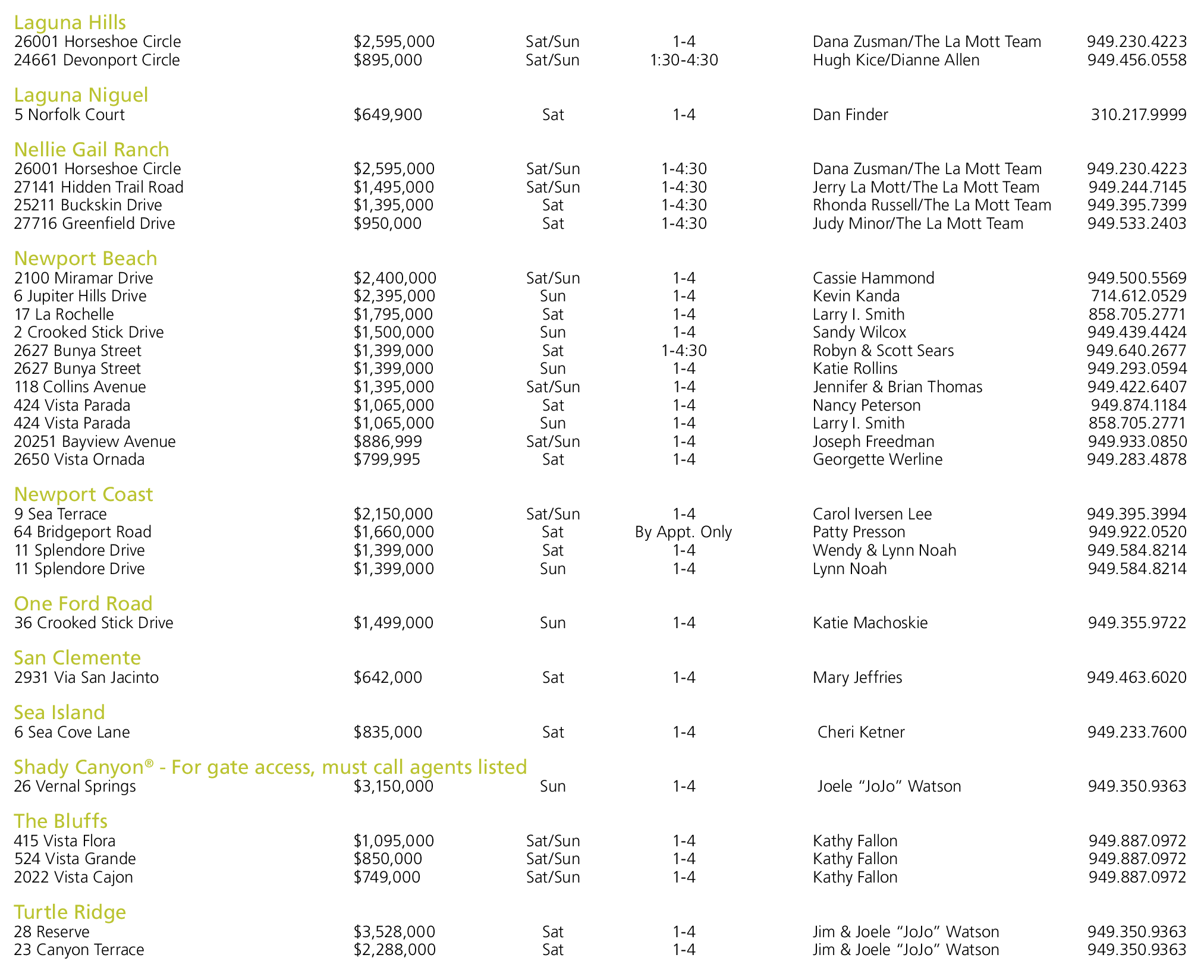 Laguna Hills 26001 Horseshoe Circle $2,595,000 Sat/Sun 1-4 Dana Zusman/The La Mott Team 949.230.4223 24661 Devonport Circle $895,000 Sat/Sun 1:30-4:30 Hugh Kice/Dianne Allen 949.456.0558 Laguna Niguel 5 Norfolk Court $649,900 Sat 1-4 Dan Finder 310.217.9999 Nellie Gail Ranch 26001 Horseshoe Circle $2,595,000 Sat/Sun 1-4:30 Dana Zusman/The La Mott Team 949.230.4223 27141 Hidden Trail Road $1,495,000 Sat/Sun 1-4:30 Jerry La Mott/The La Mott Team 949.244.7145 25211 Buckskin Drive $1,395,000 Sat 1-4:30 Rhonda Russell/The La Mott Team 949.395.7399 27716 Greenfield Drive $950,000 Sat 1-4:30 Judy Minor/The La Mott Team 949.533.2403 Newport Beach 2100 Miramar Drive $2,400,000 Sat/Sun 1-4 Cassie Hammond 949.500.5569 6 Jupiter Hills Drive $2,395,000 Sun 1-4 Kevin Kanda 714.612.0529 17 La Rochelle $1,795,000 Sat 1-4 Larry I. Smith 858.705.2771 2 Crooked Stick Drive $1,500,000 Sun 1-4 Sandy Wilcox 949.439.4424 2627 Bunya Street $1,399,000 Sat 1-4:30 Robyn & Scott Sears 949.640.2677 2627 Bunya Street $1,399,000 Sun 1-4 Katie Rollins 949.293.0594 118 Collins Avenue $1,395,000 Sat/Sun 1-4 Jennifer & Brian Thomas 949.422.6407 424 Vista Parada $1,065,000 Sat 1-4 Nancy Peterson 949.874.1184 424 Vista Parada $1,065,000 Sun 1-4 Larry I. Smith 858.705.2771 20251 Bayview Avenue $886,999 Sat/Sun 1-4 Joseph Freedman 949.933.0850 2650 Vista Ornada $799,995 Sat 1-4 Georgette Werline 949.283.4878 Newport Coast 9 Sea Terrace $2,150,000 Sat/Sun 1-4 Carol Iversen Lee 949.395.3994 64 Bridgeport Road $1,660,000 Sat By Appt. Only Patty Presson 949.922.0520 11 Splendore Drive $1,399,000 Sat 1-4 Wendy & Lynn Noah 949.584.8214 11 Splendore Drive $1,399,000 Sun 1-4 Lynn Noah 949.584.8214 One Ford Road 36 Crooked Stick Drive $1,499,000 Sun 1-4 Katie Machoskie 949.355.9722 San Clemente 2931 Via San Jacinto $642,000 Sat 1-4 Mary Jeffries 949.463.6020 Sea Island 6 Sea Cove Lane $835,000 Sat 1-4 Cheri Ketner 949.233.7600 Shady Canyon ® - For gate access, must call agents listed 26 Vernal Springs $3,150,000 Sun 1-4 Joele “JoJo” Watson 949.350.9363 The Bluffs 415 Vista Flora $1,095,000 Sat/Sun 1-4 Kathy Fallon 949.887.0972 524 Vista Grande $850,000 Sat/Sun 1-4 Kathy Fallon 949.887.0972 2022 Vista Cajon $749,000 Sat/Sun 1-4 Kathy Fallon 949.887.0972 Turtle Ridge 28 Reserve $3,528,000 Sat 1-4 Jim & Joele “JoJo” Watson 949.350.9363 23 Canyon Terrace $2,288,000 Sat 1-4 Jim & Joele “JoJo” Watson 949.350.9363
