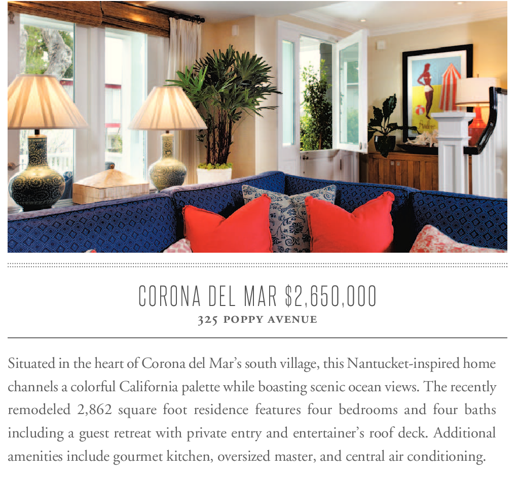 Situated in the heart of Corona del Mar’s south village, this Nantucket-inspired home channels a colorful California palette while boasting scenic ocean views. The recently remodeled 2,862 square foot residence features four bedrooms and four baths including a guest retreat with private entry and entertainer’s roof deck. Additional amenities include gourmet kitchen, oversized master, and central air conditioning.