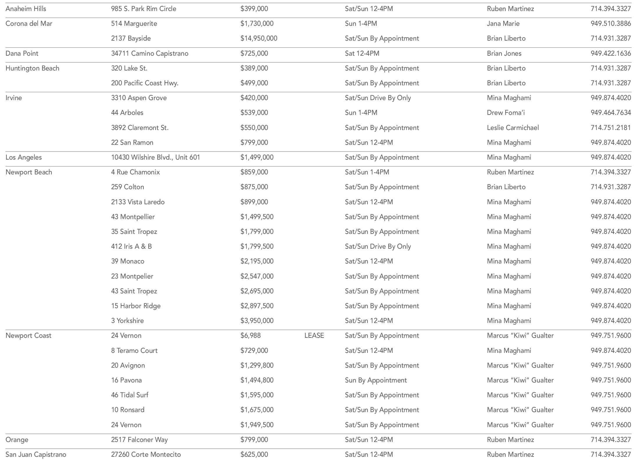 44 Arboles $539,000 Sun 1-4PM Drew Foma’i 949.464.7634 3892 Claremont St. $550,000 Sat/Sun By Appointment Leslie Carmichael 714.751.2181 22 San Ramon $799,000 Sat/Sun 12-4PM Mina Maghami 949.874.4020 Los Angeles 10430 Wilshire Blvd., Unit 601 $1,499,000 Sat/Sun By Appointment Mina Maghami 949.874.4020 Newport Beach 4 Rue Chamonix $859,000 Sat/Sun 1-4PM Ruben Martinez 714.394.3327 259 Colton $875,000 Sat/Sun By Appointment Brian Liberto 714.931.3287 2133 Vista Laredo $899,000 Sat/Sun 12-4PM Mina Maghami 949.874.4020 43 Montpellier $1,499,500 Sat/Sun By Appointment Mina Maghami 949.874.4020 35 Saint Tropez $1,799,000 Sat/Sun By Appointment Mina Maghami 949.874.4020 412 Iris A & B $1,799,500 Sat/Sun Drive By Only Mina Maghami 949.874.4020 39 Monaco $2,195,000 Sat/Sun 12-4PM Mina Maghami 949.874.4020 23 Montpelier $2,547,000 Sat/Sun By Appointment Mina Maghami 949.874.4020 43 Saint Tropez $2,695,000 Sat/Sun By Appointment Mina Maghami 949.874.4020 15 Harbor Ridge $2,897,500 Sat/Sun By Appointment Mina Maghami 949.874.4020 3 Yorkshire $3,950,000 Sat/Sun 12-4PM Mina Maghami 949.874.4020 Newport Coast 24 Vernon $6,988 LEASE Sat/Sun By Appointment Marcus “Kiwi” Gualter 949.751.9600 8 Teramo Court $729,000 Sat/Sun 12-4PM Mina Maghami 949.874.4020 20 Avignon $1,299,800 Sat/Sun By Appointment Marcus “Kiwi” Gualter 949.751.9600 16 Pavona $1,494,800 Sun By Appointment Marcus “Kiwi” Gualter 949.751.9600 46 Tidal Surf $1,595,000 Sat/Sun By Appointment Marcus “Kiwi” Gualter 949.751.9600 10 Ronsard $1,675,000 Sat/Sun By Appointment Marcus “Kiwi” Gualter 949.751.9600 24 Vernon $1,949,500 Sat/Sun By Appointment Marcus “Kiwi” Gualter 949.751.9600 Orange 2517 Falconer Way $799,000 Sat/Sun 12-4PM Ruben Martinez 714.394.3327 San Juan Capistrano 27260 Corte Montecito $625,000 Sat/Sun 12-4PM Ruben Martinez 714.394.3327