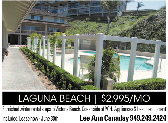 Furnished winter rental steps to Victoria Beach. Ocean side of PCH. Appliances & beach equipment included. Lease now - June 30th. Lee Ann Canaday 949.249.2424