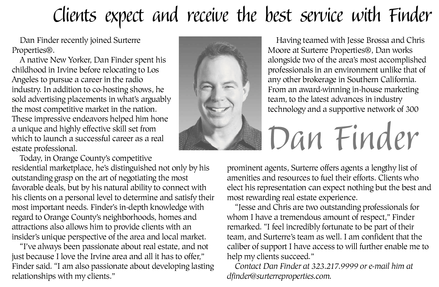 A native New Yorker, Dan Finder spent his childhood in Irvine before relocating to Los Angeles to pursue a career in the radio industry. In addition to co-hosting shows, he sold advertising placements in what’s arguably the most competitive market in the nation. These impressive endeavors helped him hone a unique and highly effective skill set from which to launch a successful career as a real estate professional.
