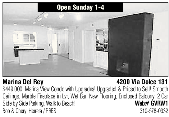 Open Sunday 1-4 Marina Del Rey 4200 Via Dolce 131 $449,000. Marina View Condo with Upgrades! Upgraded & Priced to Sell! Smooth Ceilings, Marble Fireplace in Lvr, Wet Bar, New Flooring, Enclosed Balcony, 2 Car Side by Side Parking, Walk to Beach! Web# GVRW1 Bob & Cheryl Herrera / PRES 310-578-0332 See also