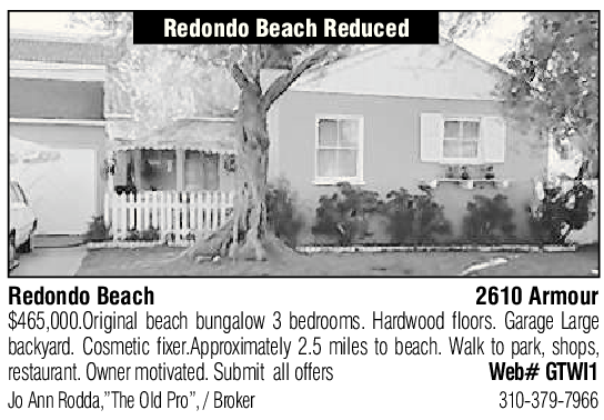 Redondo Beach Reduced Redondo Beach 2610 Armour $465,000.Original beach bungalow 3 bedrooms. Hardwood loors. Garage Large backyard. Cosmetic ixer.Approximately 2.5 miles to beach. Walk to park, shops, restaurant. Owner motivated. Submit all offers Web# GTWI1 Jo Ann Rodda,”The Old Pro”, / Broker 310-379-7966