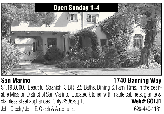 San Marino 1740 Banning Way $1,198,000. Beautiful Spanish. 3 BR, 2.5 Baths, Dining & Fam. Rms. in the desirable Mission District of San Marino. Updated kitchen with maple cabinets, granite & stainless steel appliances. Only $536/sq. ft. Web# GQLJ1 John Grech / John E. Grech & Associates 626-449-1181