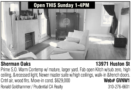 Sherman Oaks 13971 Huston St Prime S.O. Warm Contemp w/ mature, larger yard. Fab open Kitch w/sub zero, high ceiling, &recessed light, Newer master suite w/high ceilings, walk-in &french doors. Cntrl air, wood lrs. Move-in cond. $629,000 Web# GVNW1 Ronald Goldhammer / Prudential CA Realty 310-276-6601
