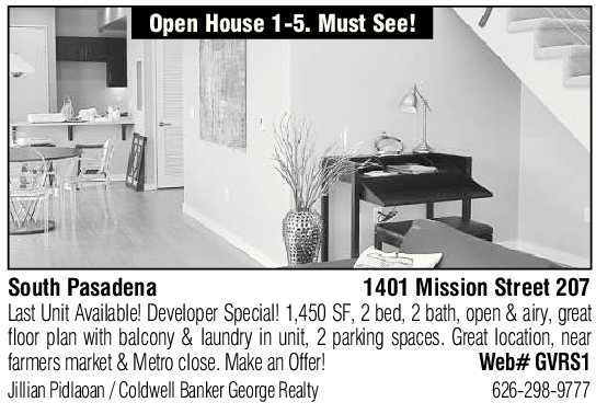 Open House 1-5. Must See! South Pasadena 1401 Mission Street 207 Last Unit Available! Developer Special! 1,450 SF, 2 bed, 2 bath, open & airy, great loor plan with balcony & laundry in unit, 2 parking spaces. Great location, near farmers market & Metro close. Make an Offer! Web# GVRS1 Jillian Pidlaoan / Coldwell Banker George Realty 626-298-9777