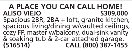 ALISO VIEJO $309,000 Spacious 2BR, 2BA + loft, granite kitchen, spacious living/dining w/vaulted ceilings, cozy FP, master w/balcony, dual-sink vanity & soaking tub & 2-car attached garage.