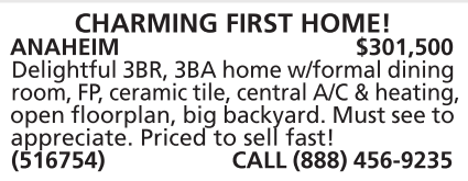 ANAHEIM $301,500 Delightful 3BR, 3BA home w/formal dining room, FP, ceramic tile, central A/C & heating, open floorplan, big backyard. Must see to appreciate. Priced to sell fast!