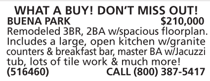 BUENA PARK $210,000 Remodeled 3BR, 2BA w/spacious floorplan. Includes a large, open kitchen w/granite counters & breakfast bar, master BA w/Jacuzzi tub, lots of tile work & much more! (516460) CALL (800) 387-5417