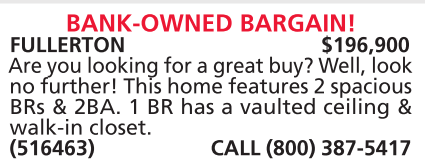 FULLERTON $196,900 Are you looking for a great buy? Well, look no further! This home features 2 spacious BRs & 2BA. 1 BR has a vaulted ceiling & walk-in closet.