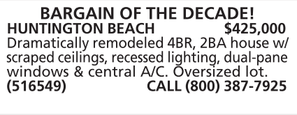 HUNTINGTON BEACH $425,000 Dramatically remodeled 4BR, 2BA house w/ scraped ceilings, recessed lighting, dual-pane windows & central A/C. Oversized lot.