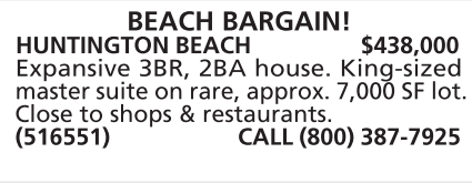 HUNTINGTON BEACH $438,000 Expansive 3BR, 2BA house. King-sized master suite on rare, approx. 7,000 SF lot. Close to shops & restaurants. (516551) CALL (800) 387-7925