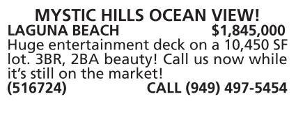LAGUNA BEACH $1,845,000 Huge entertainment deck on a 10,450 SF lot. 3BR, 2BA beauty! Call us now while it’s still on the market! (516724) CALL (949) 497-5454