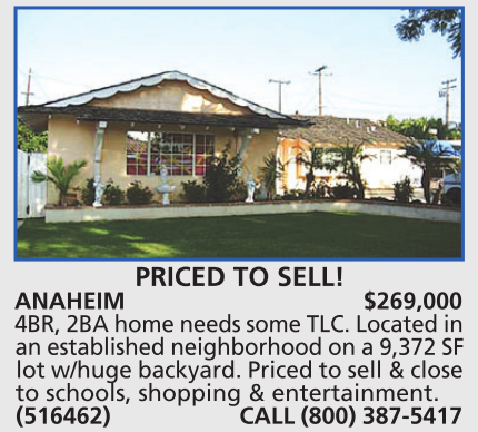 ANAHEIM $269,000 4BR, 2BA home needs some TLC. Located in an established neighborhood on a 9,372 SF lot w/huge backyard. Priced to sell & close to schools, shopping & entertainment. (516462) CALL (800) 387-5417