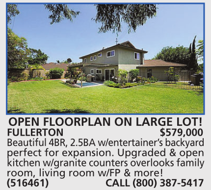 FULLERTON $579,000 Beautiful 4BR, 2.5BA w/entertainer’s backyard perfect for expansion. Upgraded & open kitchen w/granite counters overlooks family room, living room w/FP & more! (516461) CALL (800) 387-5417