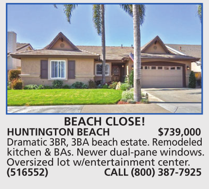 HUNTINGTON BEACH $739,000 Dramatic 3BR, 3BA beach estate. Remodeled kitchen & BAs. Newer dual-pane windows. Oversized lot w/entertainment center. (516552) CALL (800) 387-7925
