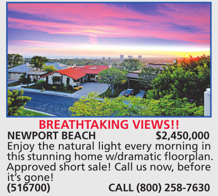 NEWPORT BEACH $2,450,000 Enjoy the natural light every morning in this stunning home w/dramatic floorplan. Approved short sale! Call us now, before it’s gone! (516700) CALL (800) 258-7630