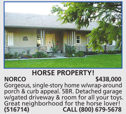 NORCO $438,000 Gorgeous, single-story home w/wrap-around porch & curb appeal. 5BR. Detached garage w/gated driveway & room for all your toys. Great neighborhood for the horse lover! (516714) CALL (800) 679-5678
