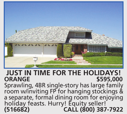 ORANGE $595,000 Sprawling, 4BR single-story has large family room w/inviting FP for hanging stockings & a separate, formal dining room for enjoying holiday feasts. Hurry! Equity seller!