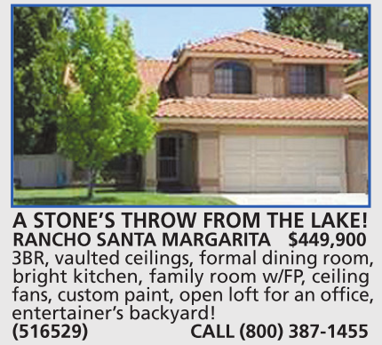 RANCHO SANTA MARGARITA $449,900 3BR, vaulted ceilings, formal dining room, bright kitchen, family room w/FP, ceiling fans, custom paint, open loft for an office, entertainer’s backyard! (516529) CALL (800) 387-1455
