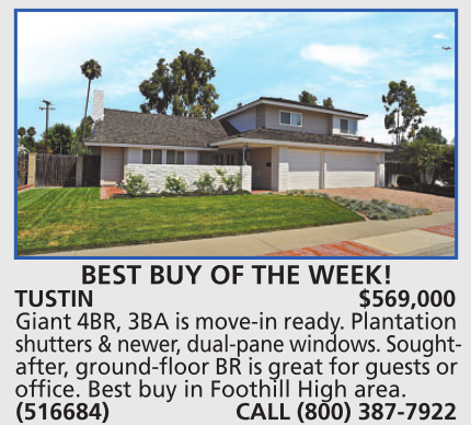 TUSTIN $569,000 Giant 4BR, 3BA is move-in ready. Plantation shutters & newer, dual-pane windows. Soughtafter, ground-floor BR is great for guests or office. Best buy in Foothill High area. (516684) CALL (800) 387-7922