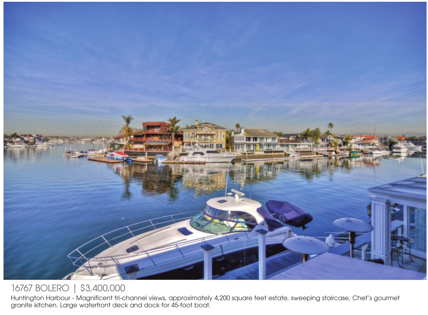 Huntington Harbour - Magnificent tri-channel views, approximately 4,200 square feet estate, sweeping staircase, Chef’s gourmet granite kitchen. Large waterfront deck and dock for 45-foot boat.