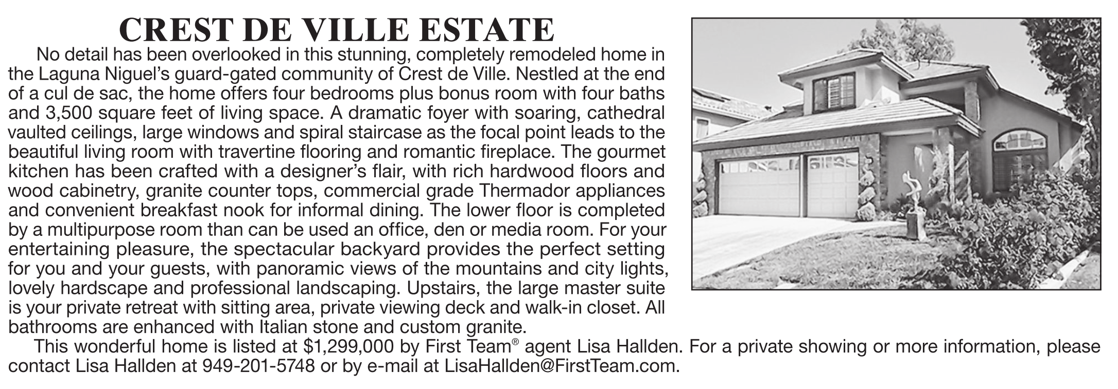 CREST DE VILLE ESTATE No detail has been overlooked in this stunning, completely remodeled home in the Laguna Niguel’s guard-gated community of Crest de Ville. Nestled at the end of a cul de sac, the home offers four bedrooms plus bonus room with four baths and 3,500 square feet of living space. A dramatic foyer with soaring, cathedral vaulted ceilings, large windows and spiral staircase as the focal point leads to the beautiful living room with travertine flooring and romantic fireplace. The gourmet kitchen has been crafted with a designer’s flair, with rich hardwood floors and wood cabinetry, granite counter tops, commercial grade Thermador appliances and convenient breakfast nook for informal dining. The lower floor is completed by a multipurpose room than can be used an office, den or media room. For your entertaining pleasure, the spectacular backyard provides the perfect setting for you and your guests, with panoramic views of the mountains and city lights, lovely hardscape and professional landscaping. Upstairs, the large master suite is your private retreat with sitting area, private viewing deck and walk-in closet. All bathrooms are enhanced with Italian stone and custom granite. This wonderful home is listed at $1,299,000 by First Team ® agent Lisa Hallden. For a private showing or more information, please contact Lisa Hallden at 949-201-5748 or by e-mail at LisaHallden@FirstTeam.com.