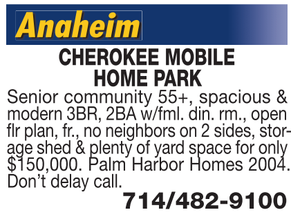 Anaheim CHEROKEE MOBILE HOME PARK Senior community 55+, spacious & modern 3BR, 2BA w/fml. din. rm., open flr plan, fr., no neighbors on 2 sides, storage shed & plenty of yard space for only $150,000. Palm Harbor Homes 2004. Don’t delay call. 714/482-9100