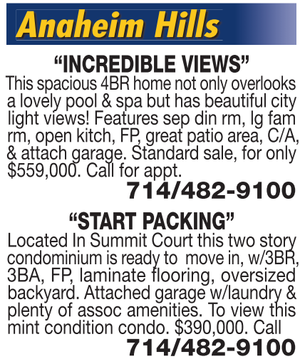 Anaheim Hills “INCREDIBLE VIEWS” This spacious 4BR home not only overlooks a lovely pool & spa but has beautiful city light views! Features sep din rm, lg fam rm, open kitch, FP, great patio area, C/A, & attach garage. Standard sale, for only $559,000. Call for appt. 714/482-9100 “START PACKING” Located In Summit Court this two story condominium is ready to move in, w/3BR, 3BA, FP, laminate flooring, oversized backyard. Attached garage w/laundry & plenty of assoc amenities. To view this mint condition condo. $390,000. Call 714/482-9100