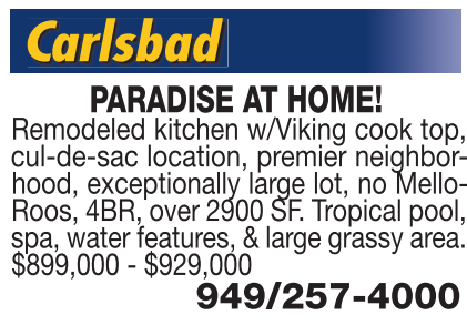 Carlsbad PARADISE AT HOME! Remodeled kitchen w/Viking cook top, cul-de-sac location, premier neighborhood, exceptionally large lot, no Mello- Roos, 4BR, over 2900 SF. Tropical pool, spa, water features, & large grassy area. $899,000 - $929,000 949/257-4000