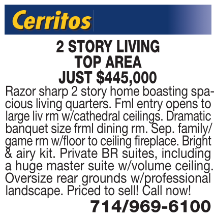 Cerritos 2 STORY LIVING TOP AREA JUST $445,000 Razor sharp 2 story home boasting spacious living quarters. Fml entry opens to large liv rm w/cathedral ceilings. Dramatic banquet size frml dining rm. Sep. family/ game rm w/floor to ceiling fireplace. Bright & airy kit. Private BR suites, including a huge master suite w/volume ceiling. Oversize rear grounds w/professional landscape. Priced to sell! Call now! 714/969-6100
