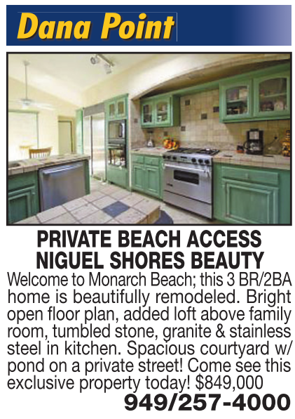 Dana Point PRIVATE BEACH ACCESS NIGUEL SHORES BEAUTY Welcome to Monarch Beach; this 3 BR/2BA home is beautifully remodeled. Bright open floor plan, added loft above family room, tumbled stone, granite & stainless steel in kitchen. Spacious courtyard w/ pond on a private street! Come see this exclusive property today! $849,000 949/257-4000