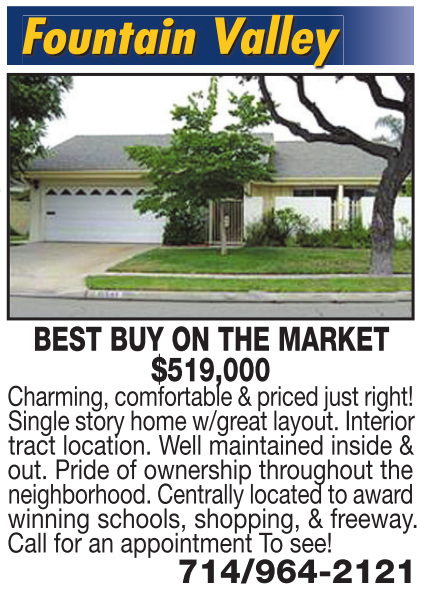 2004. conditioning, Fountain Valley BEST BUY ON THE MARKET $519,000 Charming, comfortable & priced just right! Single story home w/great layout. Interior tract location. Well maintained inside & out. Pride of ownership throughout the neighborhood. Centrally located to award winning schools, shopping, & freeway. Call for an appointment To see! 714/964-2121